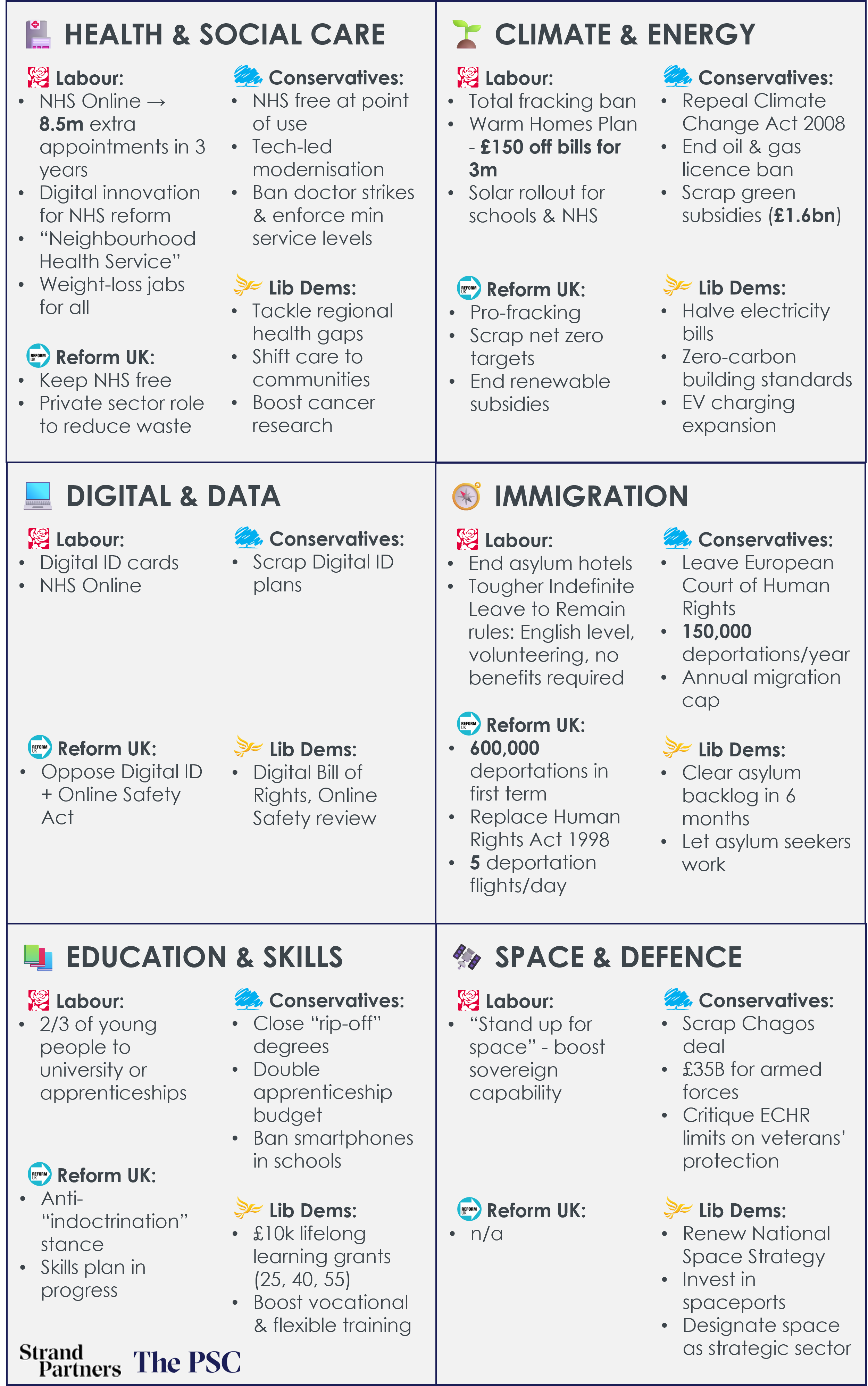 In the autumn 2025 conference season, the UK’s major parties - Labour Party, Conservative Party, Liberal Democrats and Reform UK - laid out divergent visions for public services. What emerges is a clear contrast between investments and modernisation, cost-cutting and decentralisation, as well as competing claims over who should deliver and pay for those services. In this blog, The PSC has teamed up with Strand Partners to distil the key messages from these four party conferences across six areas: health and social care, sustainability and climate change, digital and data, immigration, education, and space and defence. We’ve also included a short summary at the end covering the Scottish National Party’s (SNP) key pledges.